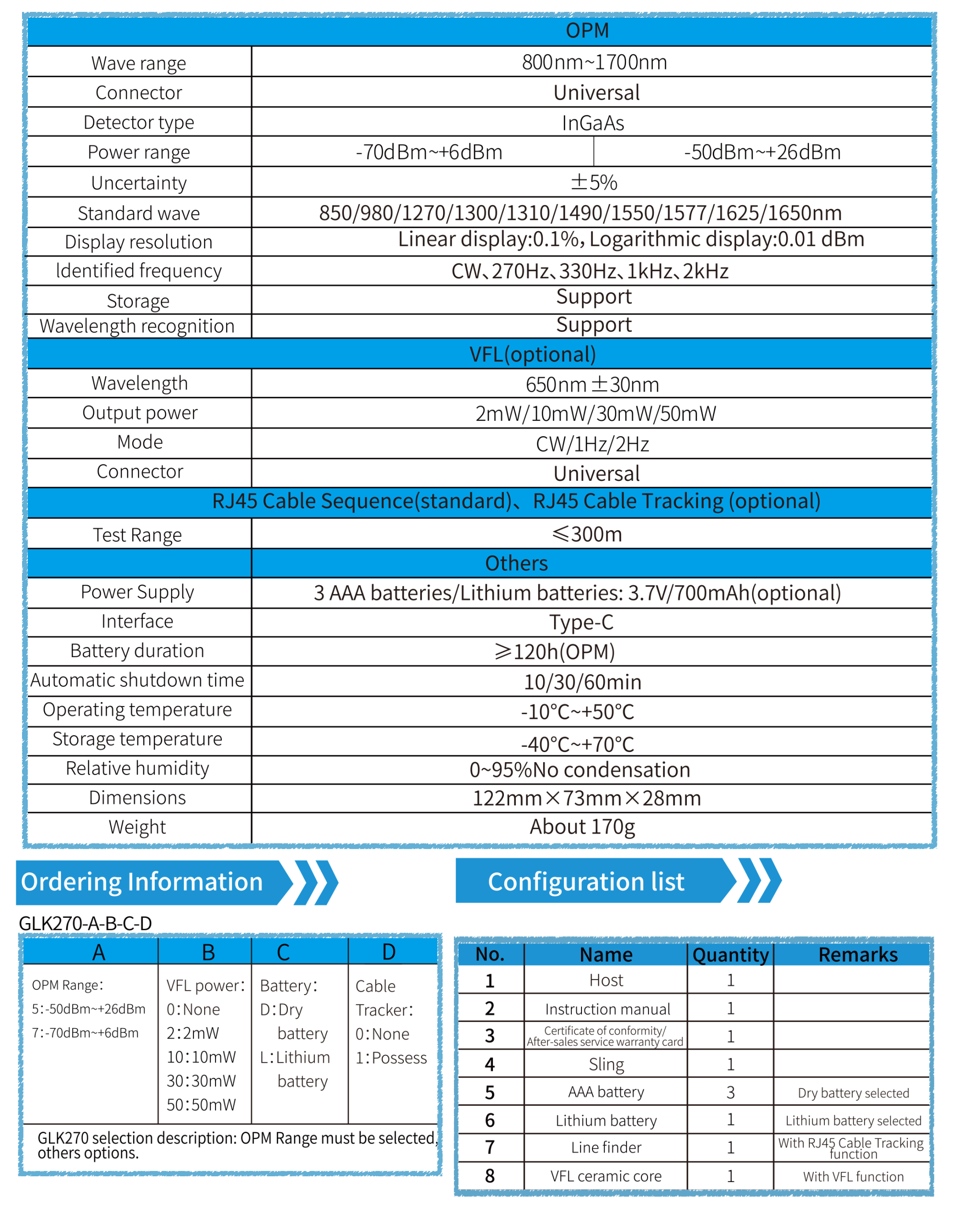 GLK270 OPM/OPM&VFL series products use single chip microprocessor control,Complete Functions 。 adopt embedded detector and laser,which can be well protect- ed.The machine has 10 standard wavelengths such as 1270nm/1577nm,and also has frequency recognition, wavelength recognition,automatic shutdown,CW/1Hz/2Hz three red light modes,backlight display,wavelength memory,user calibration,lighting and other func- tions.while supporting Support RJ45 cable sequence and line hunting test,wide test range,high accuracy. GLK270 mainly used for continuous optical signal power measurement,optical fiber link loss test and optical fiber line on-off test.They are widely used in optical cable construction and maintenance,optical fiber communica- tion,optical cable sensing,optical CATVand other fields.